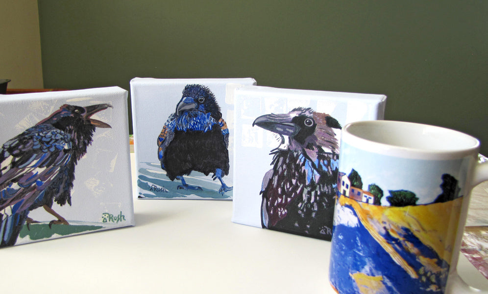 Part of a series of ravens, the small-sized canvases are sure to be collectors' treasures.